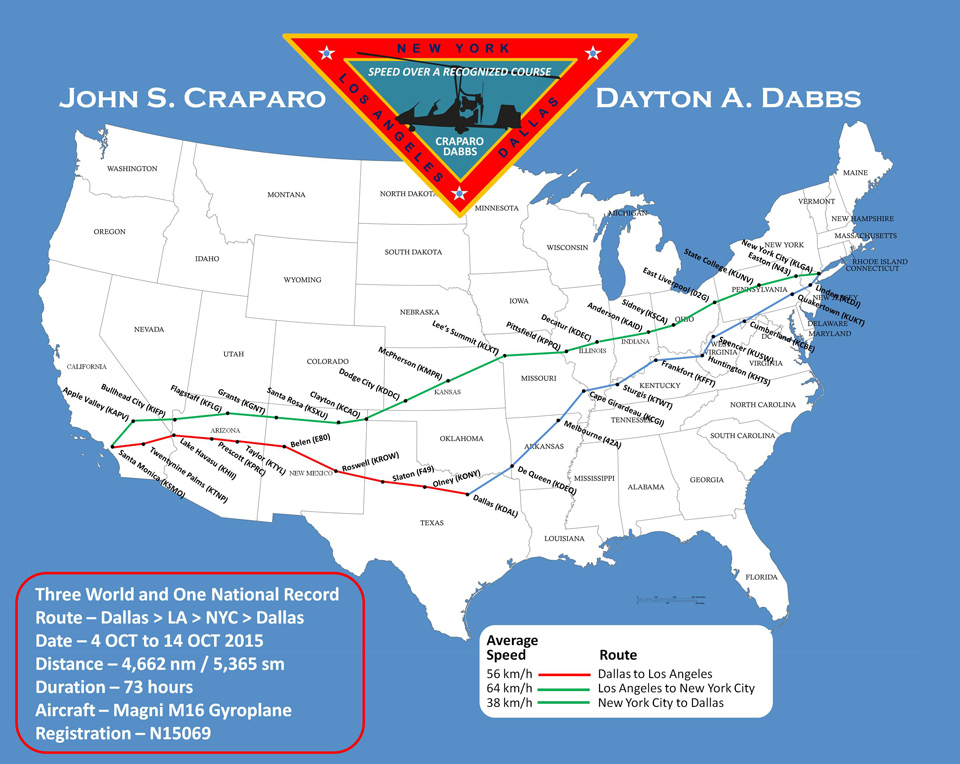 Craparo, age 56, and Dabbs, age 30, copiloted and alternated as pilot in command of a Magni M-16 gyroplane for the 73-hour, 5,365-statue-mile flight.