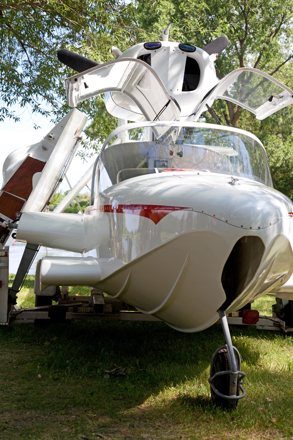 One of our volunteers who knows this gentleman casually mentioned him to me during our SPB spring work weekend. Hearing the story I said to myself, “I can change that!” So I made arrangements with him to bring his plane to AirVenture on the custom trailer he also built, and we set it up under a nice tree on the lawn and folded one wing out so all those passing by would notice it. For the entire week, pretty much from sun up to sun down he would sit in a chair talking with people, much like many do that fly their planes into Oshkosh. He had trouble walking so we had to help him with the golf cart to and from the airplane when needed, but it was quite obvious he was having the time of his life. And while it was really no big deal for me or my volunteer staff to accommodate him, he told me repeatedly how much he appreciated what we did to help him fulfill his dream of getting his airplane to Oshkosh. And while there are always a lot of cool or fun things that seem to happen during the EAA convention, this year the height of my week was seeing this one old man’s face light up whenever someone stopped to talk with him and admire his labor of love.