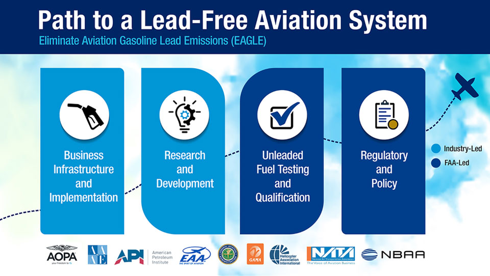 Other groups committed to the EAGLE initiative include the Aircraft Owners and Pilots Association (AOPA), American Association of Airport Executives (AAAE), American Petroleum Institute (API), General Aviation Manufacturers Association (GAMA), Helicopter Association International (HAI), National Air Transportation Association (NATA), and National Business Aviation Association (NBAA).