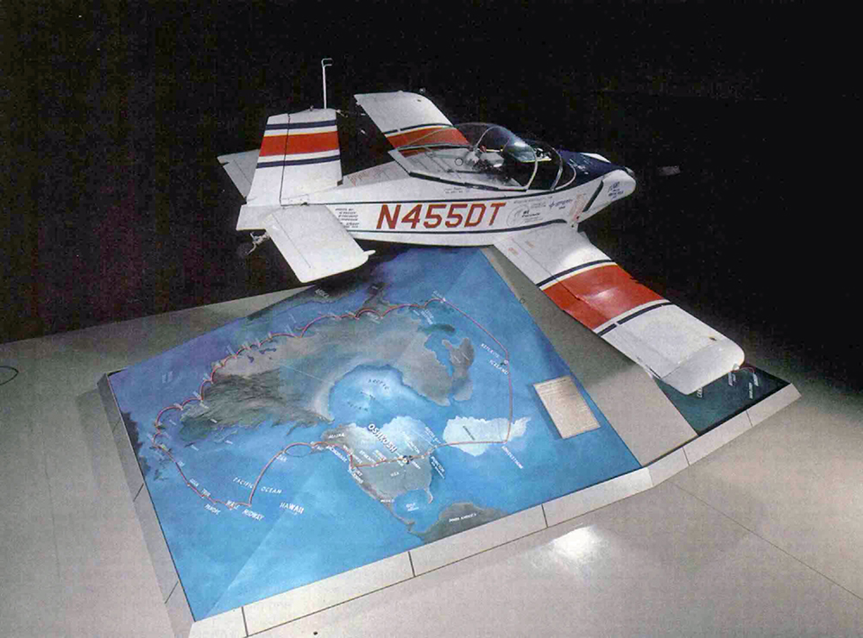 Don named the airplane Victoria after the only ship of the Magellan fleet to complete the first world-circling trip. After increasingly rigorous testing and continuous improvements to the airplane, Don departed from Runway 18 at what is now Wittman Regional Airport here in Oshkosh on August 1, 1976. Sixty days and 26,200 miles later, he landed back in Oshkosh on September 30 having completed the first circumnavigation in a homebuilt. In 1983, Don donated N455DT to EAA, and it’s been on display in our museum ever since.